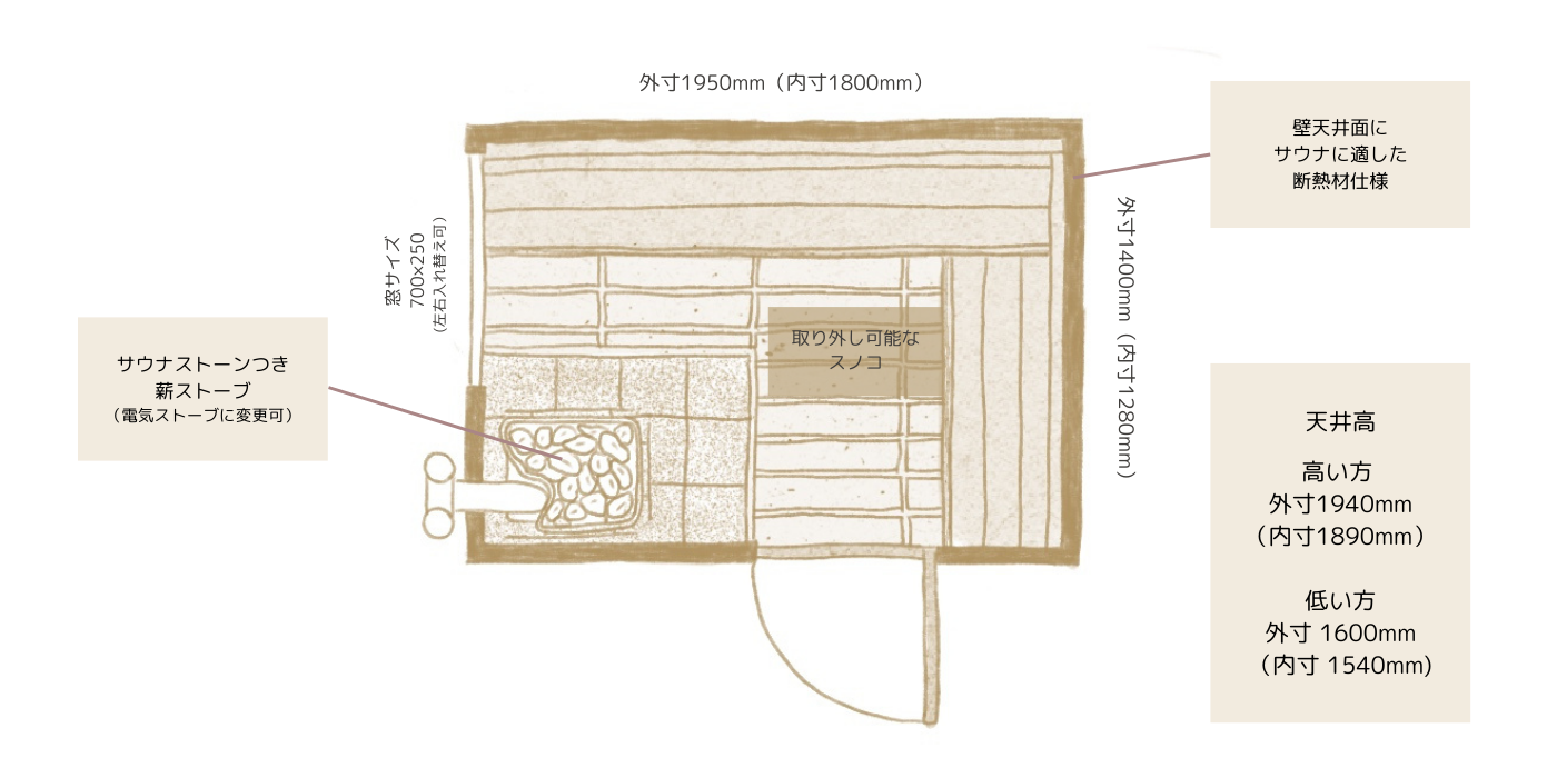 仕様 / 価格 2024.02.192024.08.02 仕様 / 価格 サイズや搭載設備の仕様と価格についてご説明します。 まずはお好きな外観とお色をお選びください。 まずはお好きな外観と お色をお選びください。 鎧張りタイプ ¥1,800,000(税抜) 外観色 ※写真の外観色はナチュラルになります ナチュラル チェスナット ウォルナット 漆喰タイプ ¥1,718,000(税抜) 外観色 ※写真の外観色はアイボリーになります ホワイト アイボリー グレー <標準搭載物>薪ストーブ、煙突、サウナストーン、窓(一面/FIX)、椅子下照明<オプション>電気ストーブへの変更、室内灯の追加、外灯の追加<その他>窓の位置のみ左右で選ぶ事ができます。スノコは取り外し可能。設置費用は上記価格とは別途費用になります。ご購入やお見積りをご希望の方は、お問い合わせフォームより設置場所の写真を添付して送付をお願いいたします。そのほかご不明点は下記LINEよりお気軽にどうぞ。 LINEで問い合わせる